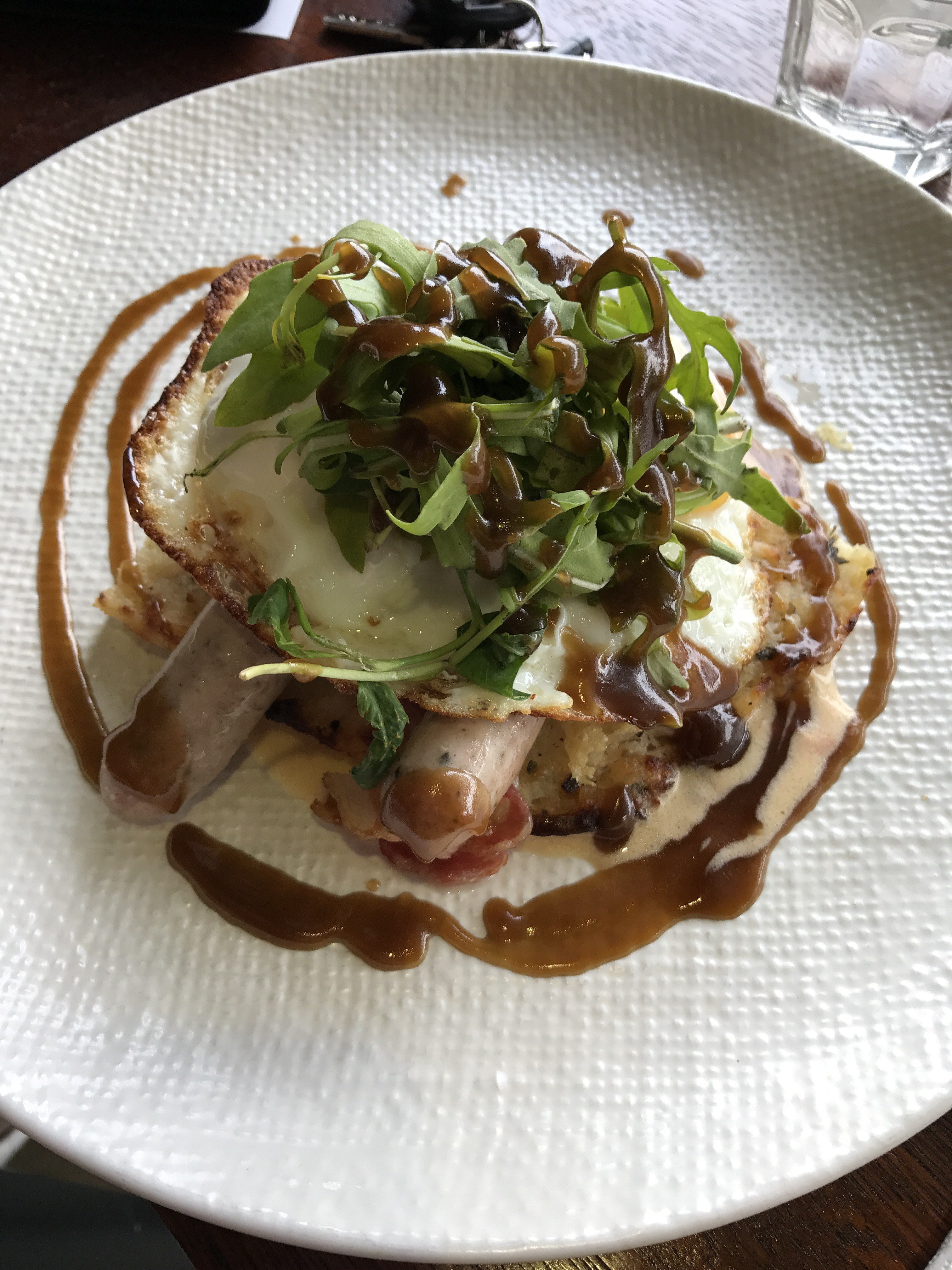Atlas Hash ($19). Homemade hash right at the bottom topped with sausages, bacon, a crispy sunny side up egg, handful of rocket leaves and special Atlas sauce.