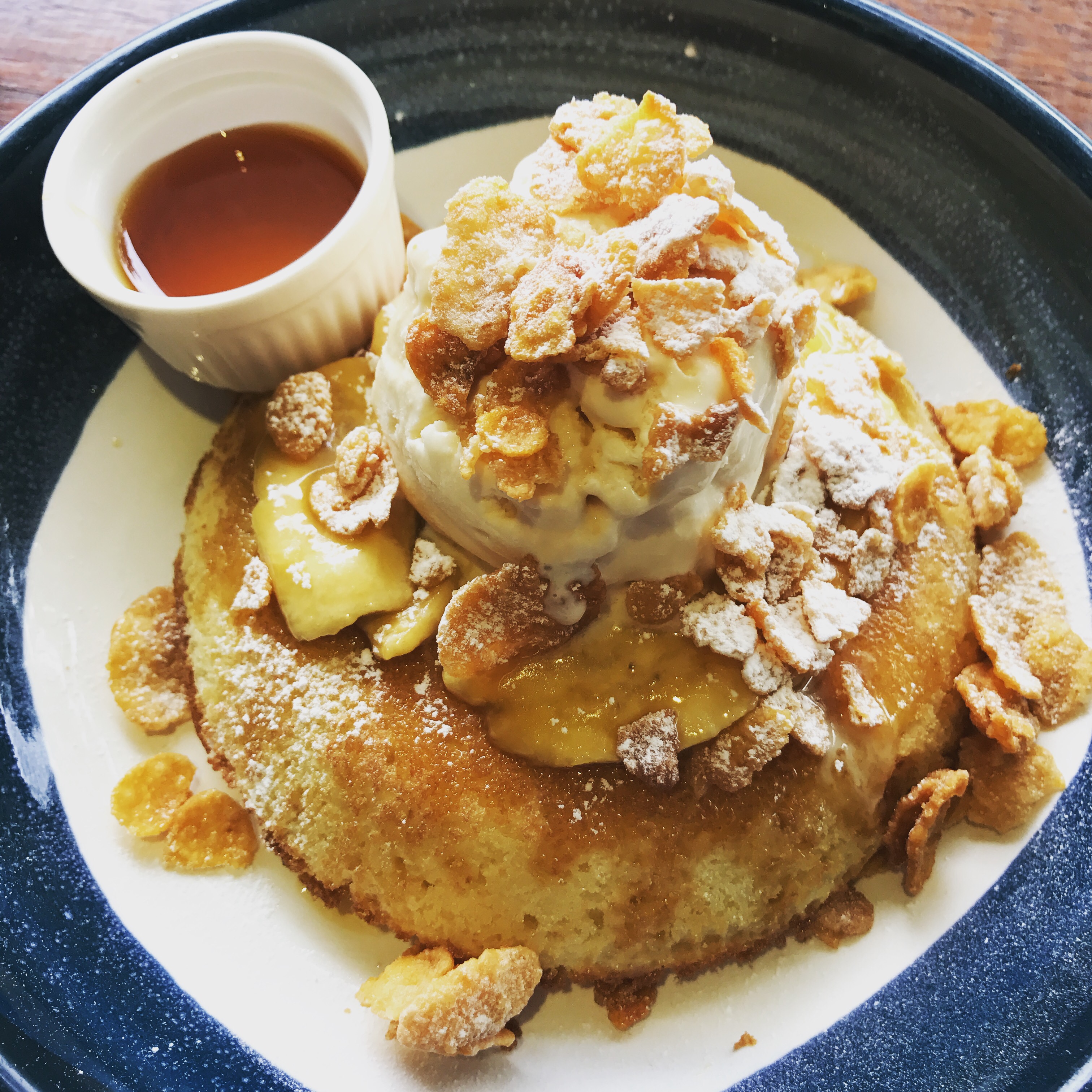 Butterscotch Banana Pancake ($18.50). Butterscotch pancake with bananas, cornflakes, vanilla ice cream and maple syrup to drizzle.