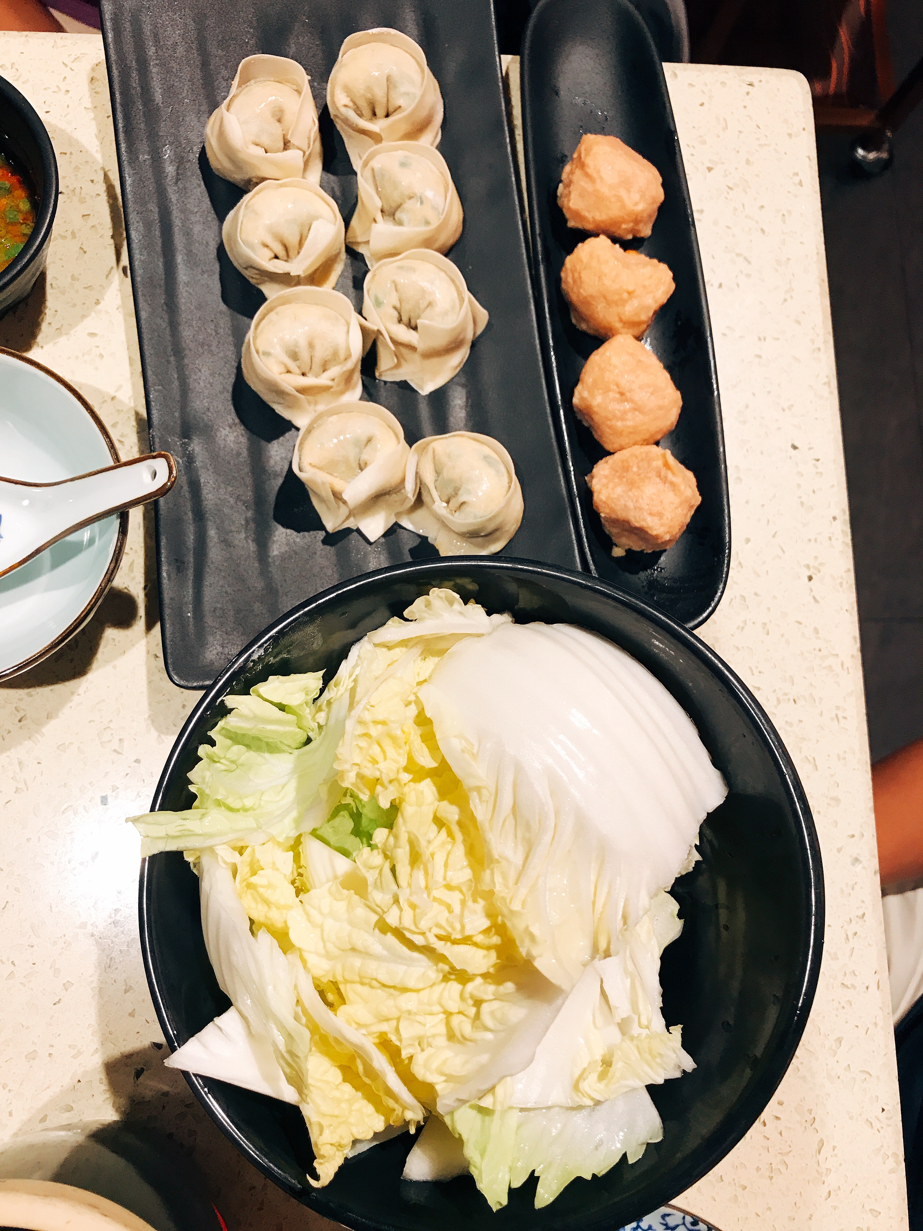 Dumplings, Meatball with cheese, Chinese cabbage.