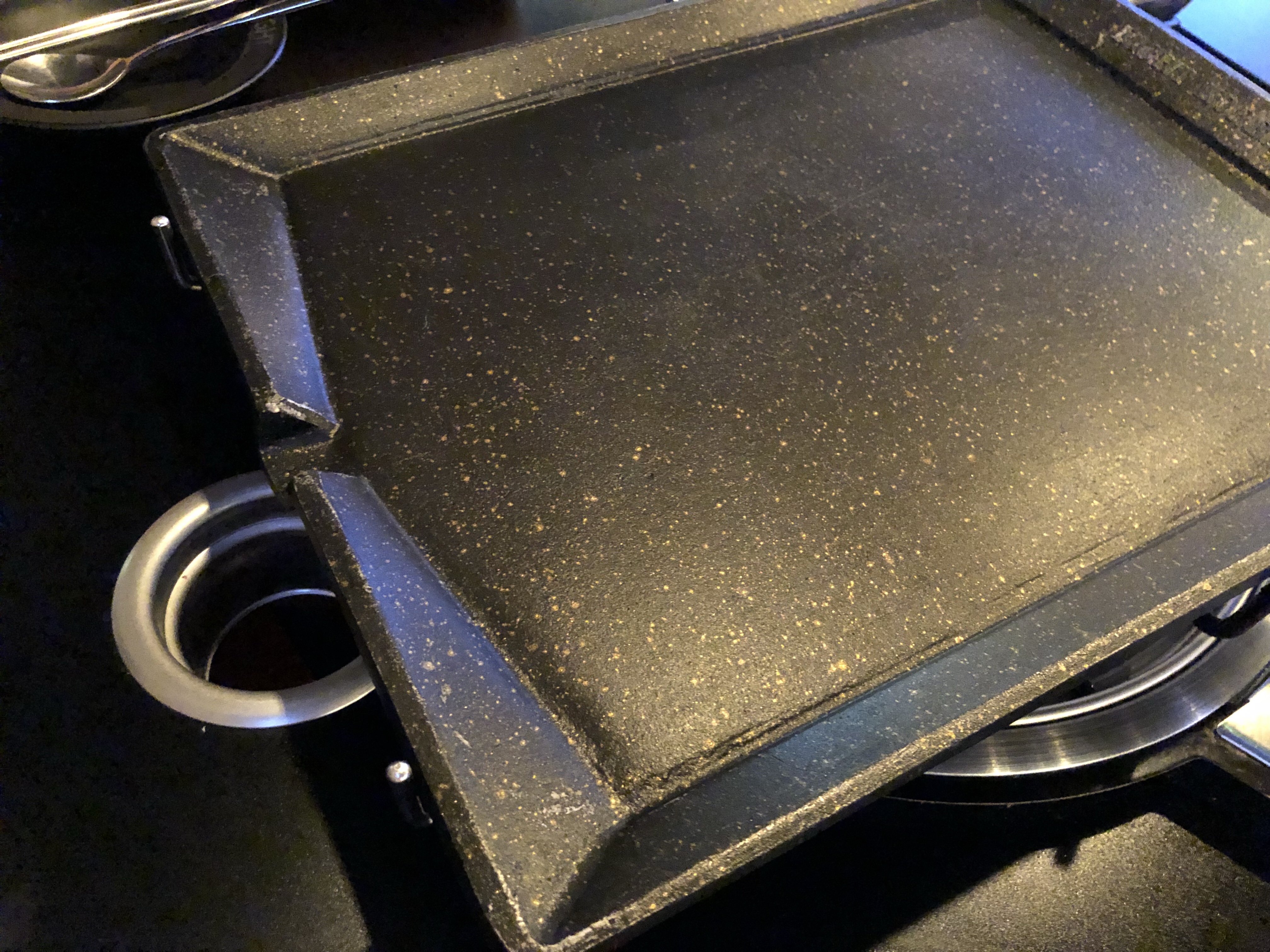 The hot plate is tilted at an angle which allows the oil to flow into a hole embedded in the table. Talk about well designed tables.