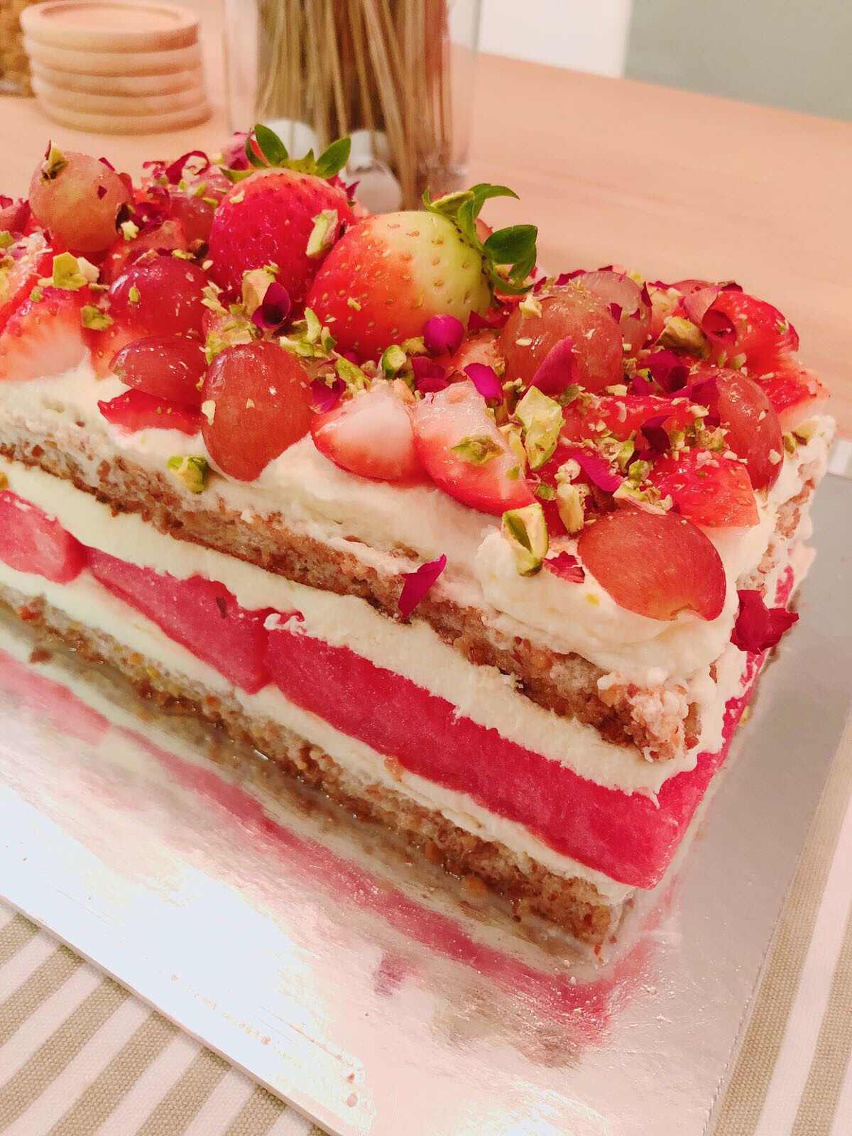 - Let your watermelon dry out for as long as possible. Mine wasn’t dry enough and after I assembled the cake, water started to seep into the cream and almond dacquoise. Had a super soggy cake base as a result. 😦