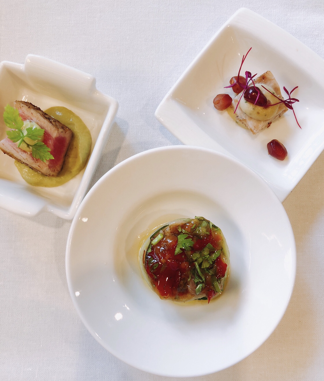 Top left clockwise: Pistachio Crusted Tuna Salad with Avocado Cream, Pork Belly Salad with Anchovy Mayonnaise, Barbecued Duck Salad.