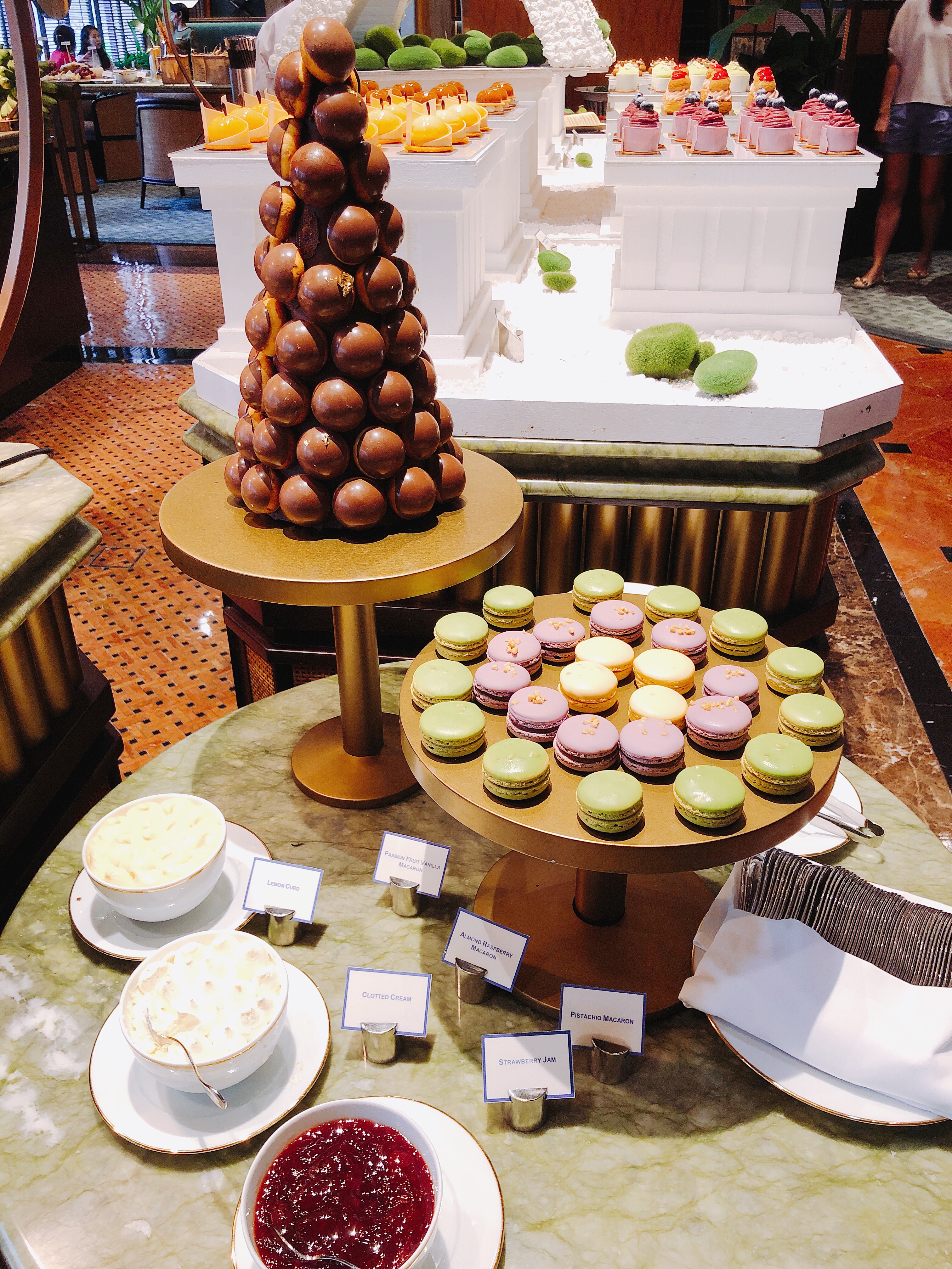 Sauces for scones and waffles (not in picture), Croquembouche, assorted macaroons.