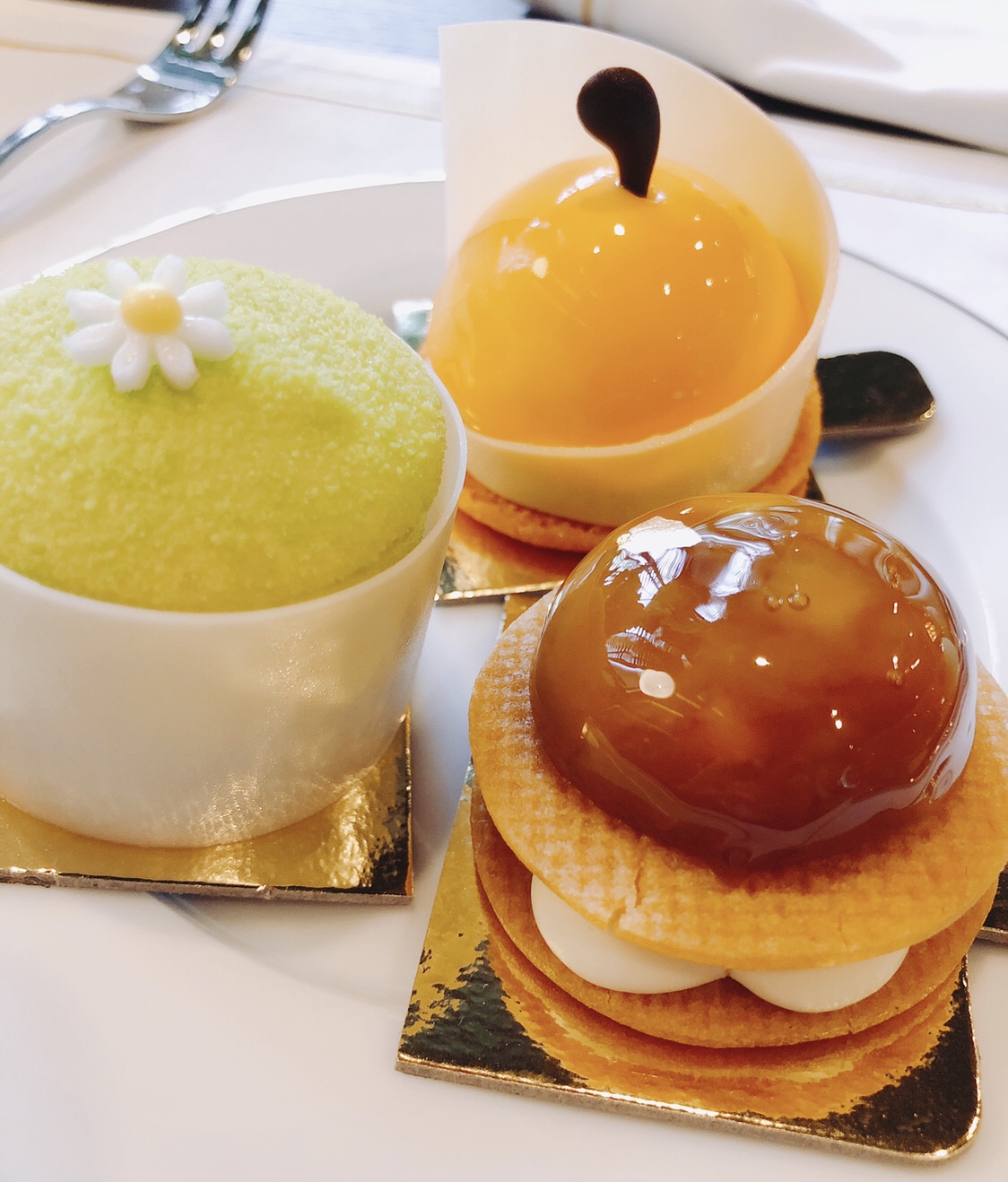 From left clockwise: Poached Pear with Sugar Syrup, Citrus Cheesecake Tart, Caramel Apple Yuzu with Tarte Tatin.