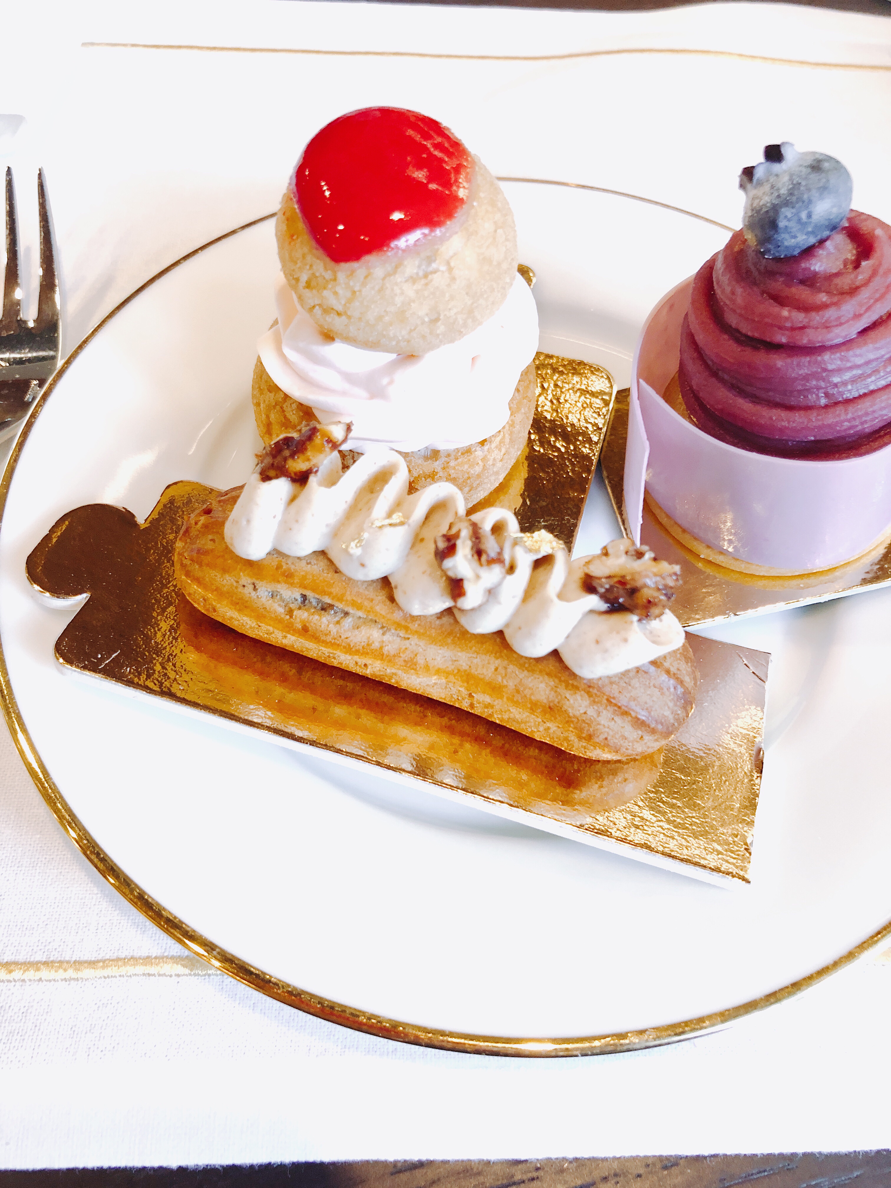 From top left clockwise: Raspberry Lychee Religieuse, Cassis Montblanc, Tahitian Vanilla Caramelised Pecan Eclair.