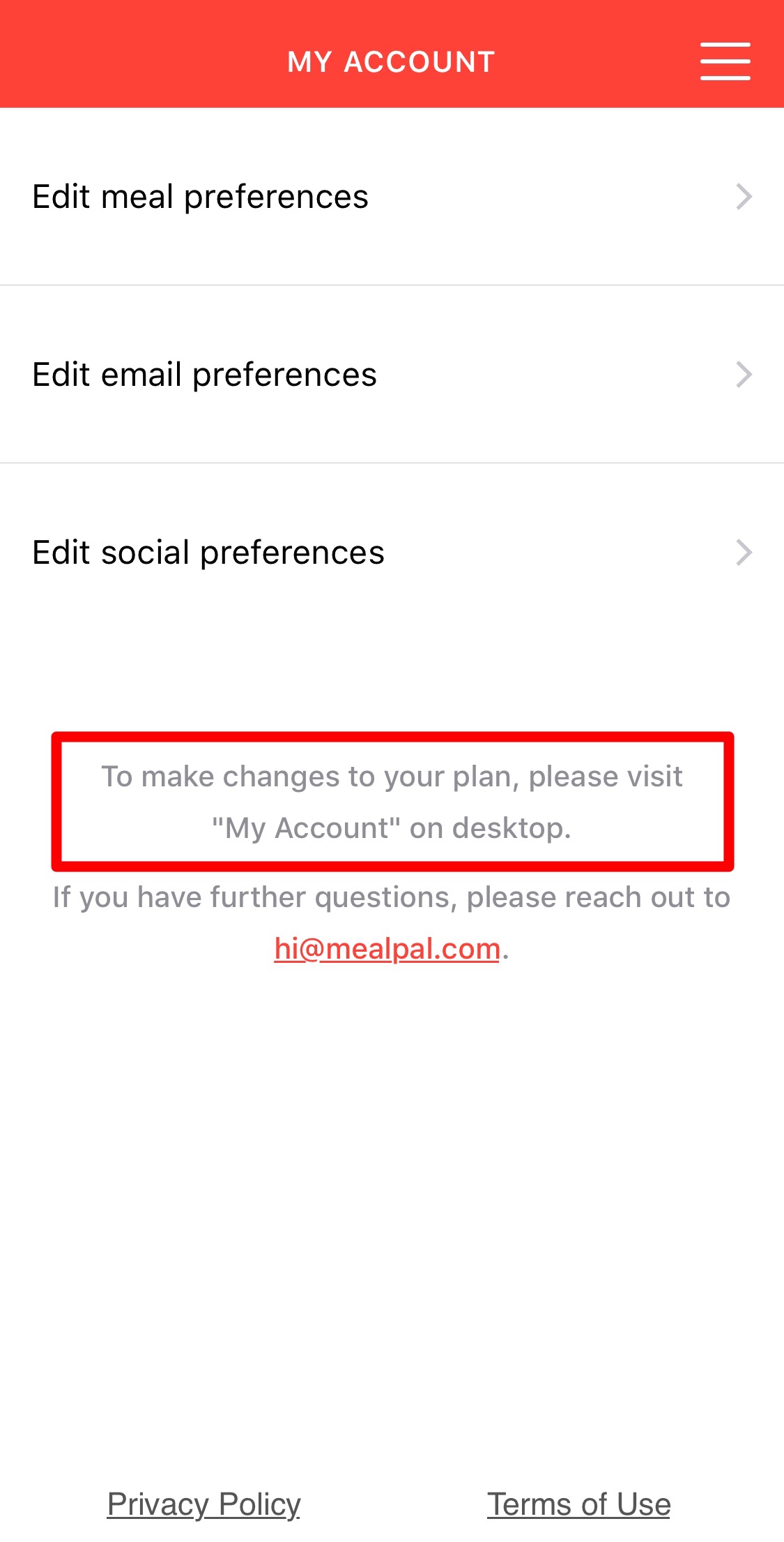 “For a cancellation to be effective for your next Membership Cycle, it must be received at least 7 days prior to the end of your then-current Membership Cycle or before you reserve your last meal in your cycle, whichever comes first. To cancel a membership, i) email hi@mealpal.com with “Cancel Membership” in the subject line; or ii) access “My Account” from the MealPal dropdown. To cancel your membership in My Account, click “Change Plan for Next Cycle”; then “Hold or Cancel My Account”; and then “Cancel Account”. ”