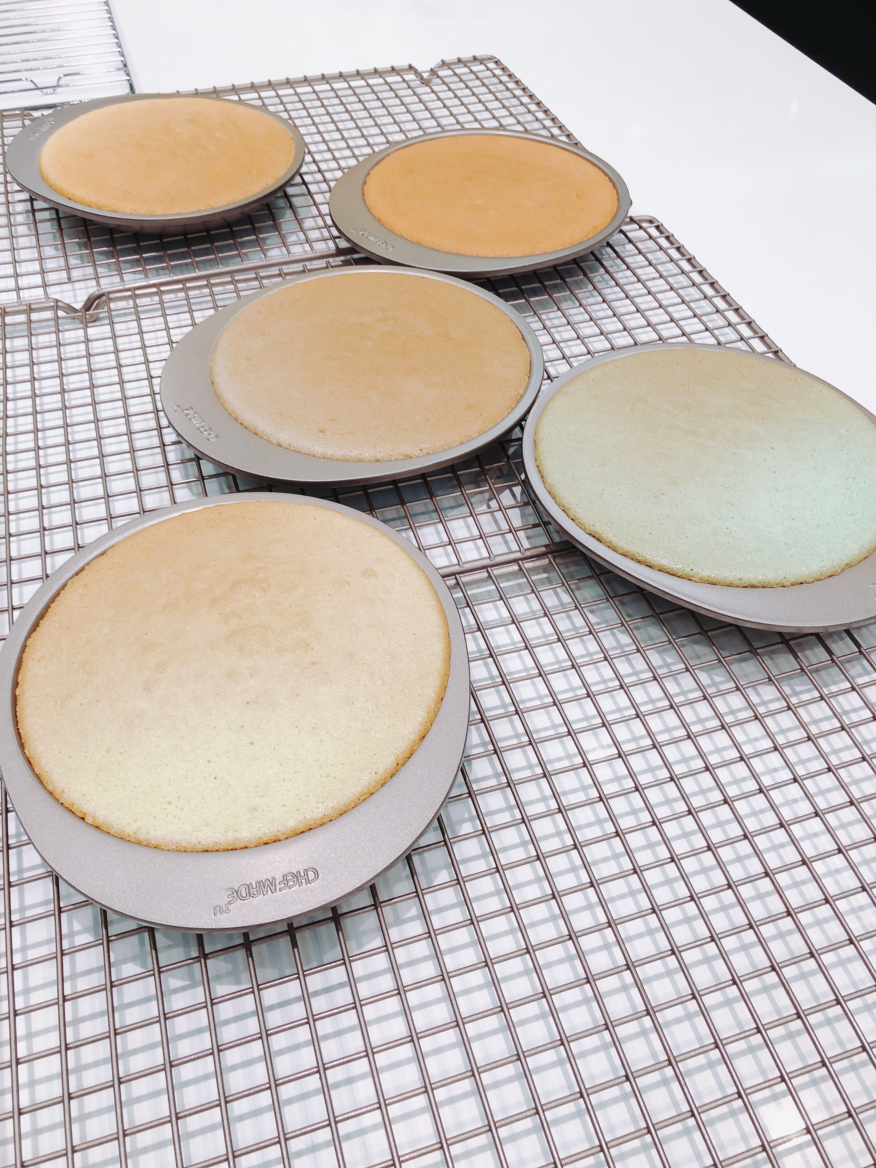 After stacking the coloured cakes on top of each other (haha they even instruct you which colours to stack first so you get that nice contrast in between the colours), you can slap on the soft cream and freeze your cake in the blast chiller before decorating.