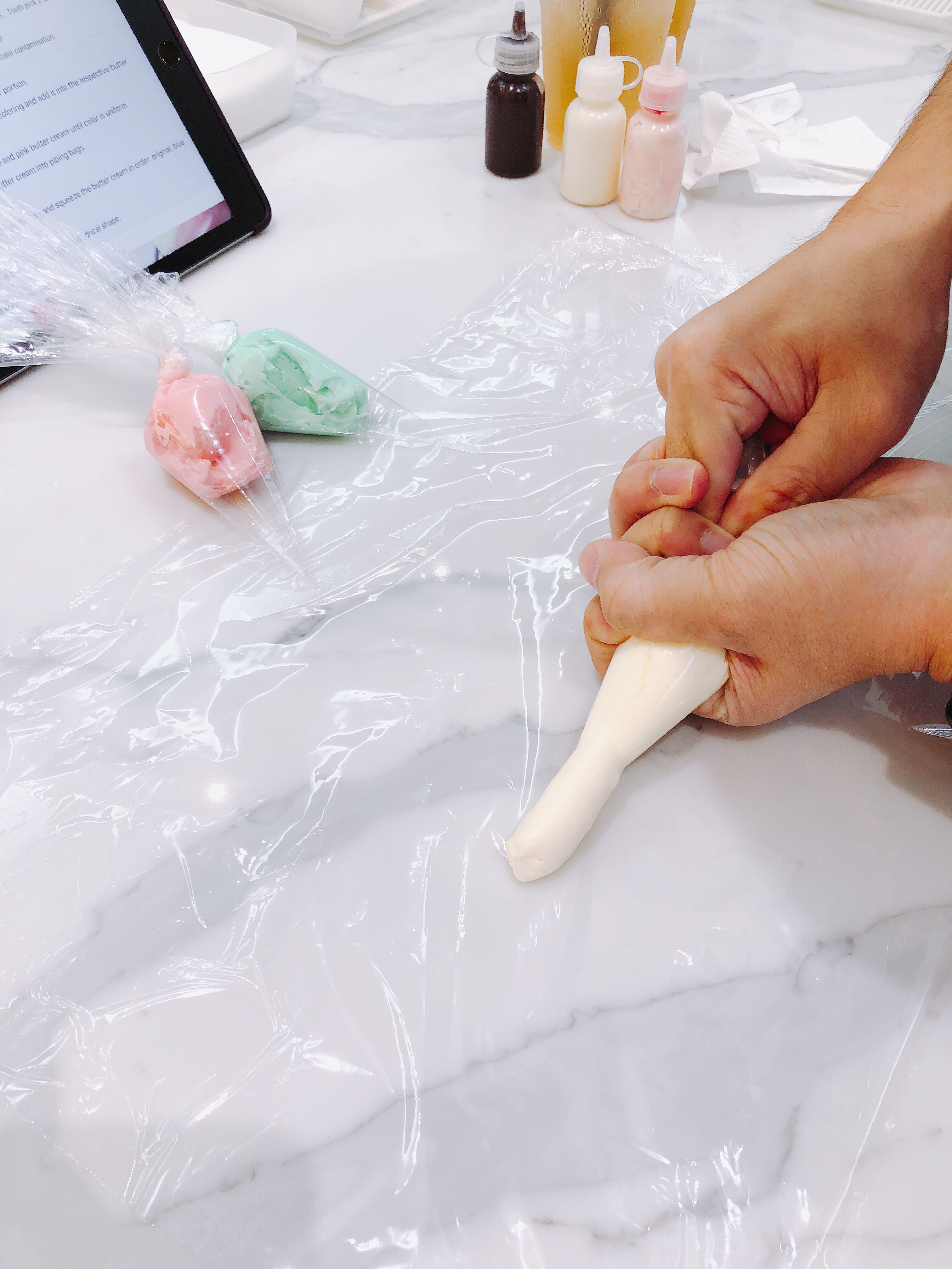 While the buttercream was already provided (i.e., you don’t do it from scratch), you have to colour the buttercream separately before combining them into one huge tube. By the way, do you see those three little squeeze bottles at the back? Those were used to draw the eyes and ears!