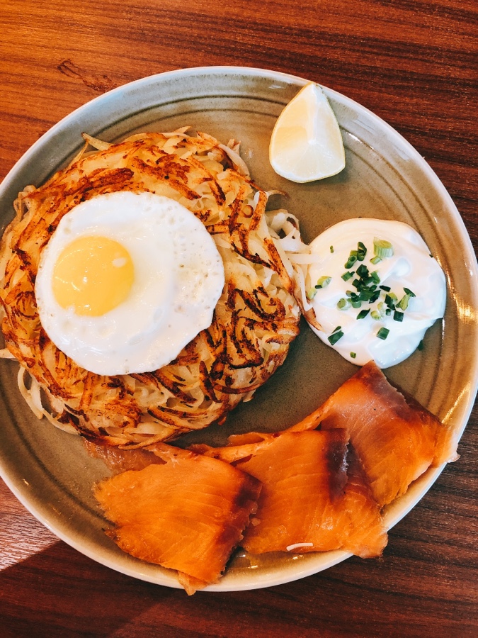 Rosti with Smoked Salmon and Sunny Side Up Egg, $14.50.