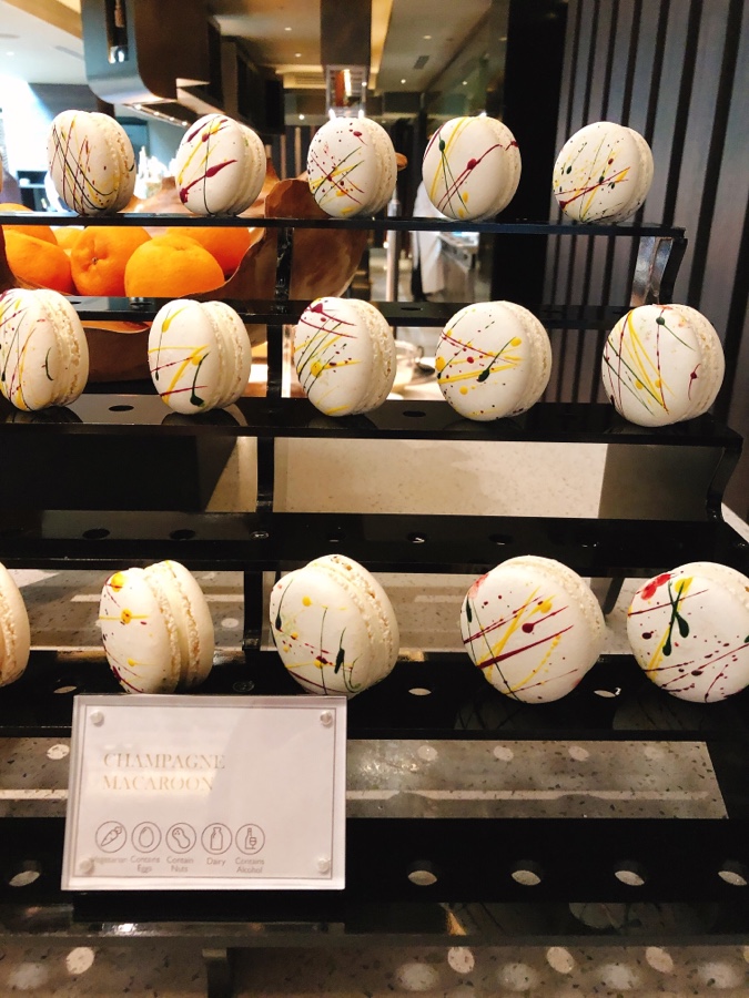 These babies are huge! Colourfully decorated, the champagne flavour was strong and satisfying. But they were replaced with tiny macaroons after they ran out. What a pity.