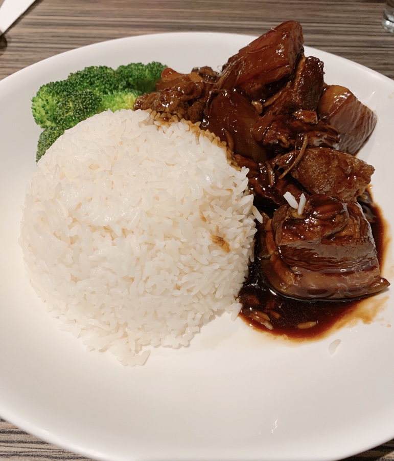 Teow Chow Stewed Pork Belly with Broccoli and Beancurd on Steamed White Rice, £9.50.