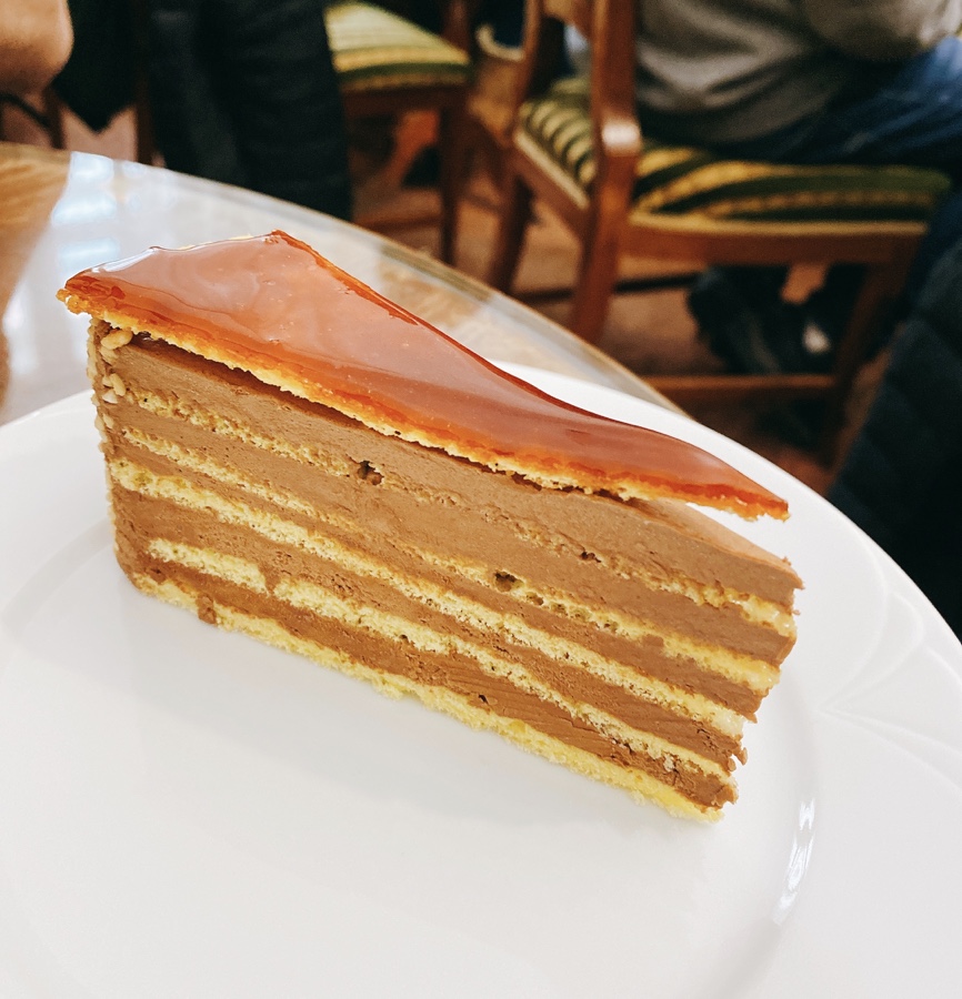 Also known as Dorbos Torta, the six layer spongecake with chocolate buttercream in between is topped with a hardened caramel layer. Apparently it was created during a time where cooling techniques were limited, so preserving the shelf life of the cake was a priority. The hardened caramel on top works as a barrier, preventing the spongecake and buttercream from drying out too quickly.