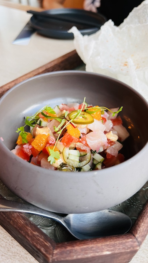 Refreshing swordfish salsa mix but wow the crispy light rice cracker sealed the deal for me.