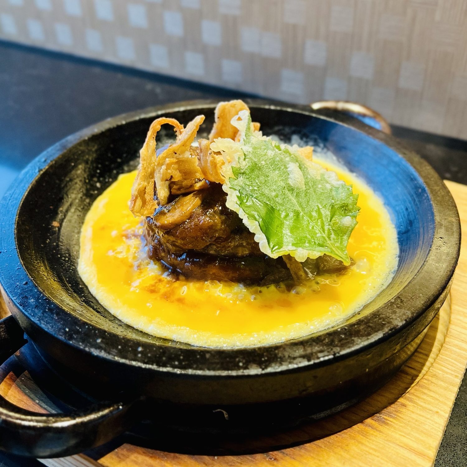This theatrical dish was served on a piping hot hotplate, allowing you to watch the eggs slowly cook as you cut straight into the A4 wagyu hamburg. It looks messy, but the elements in this dish presented themselves coherently. Think crispy rice at the bottom, soft wagyu hamburg, lightly battered vegetable tempura and warm jiggly egg. What’s there not to like about this dish?!